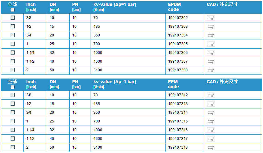 閥門個(gè)別配置(參見表格)